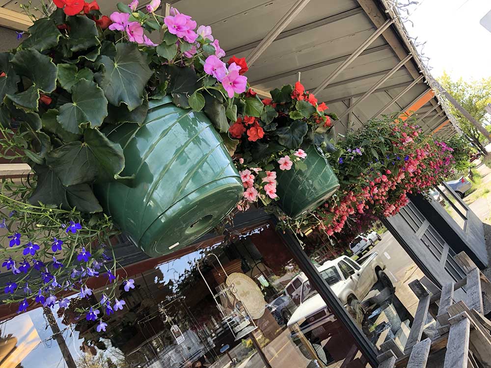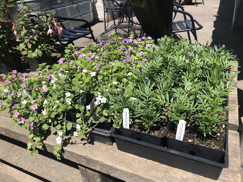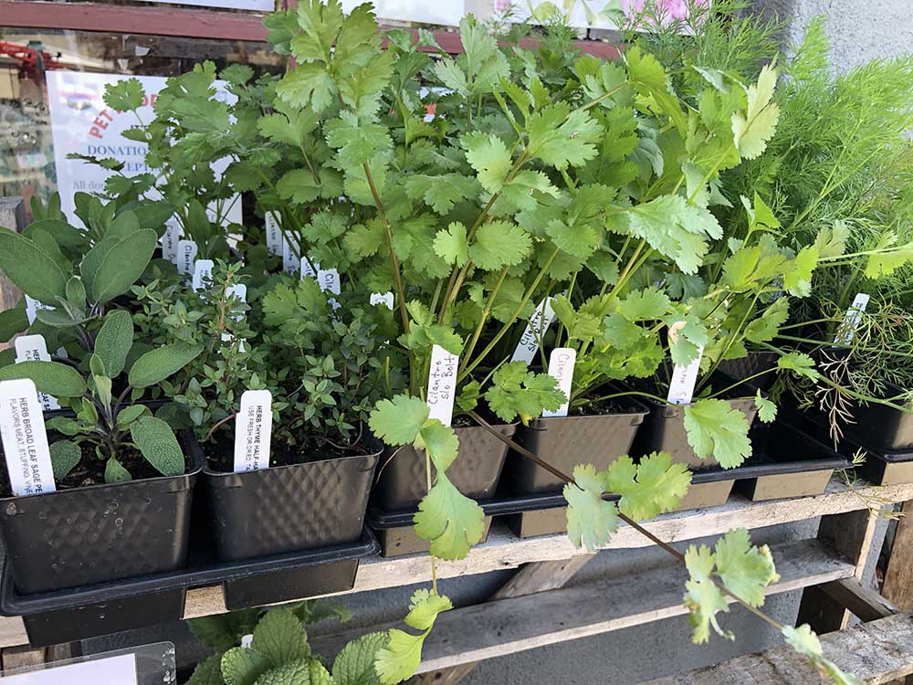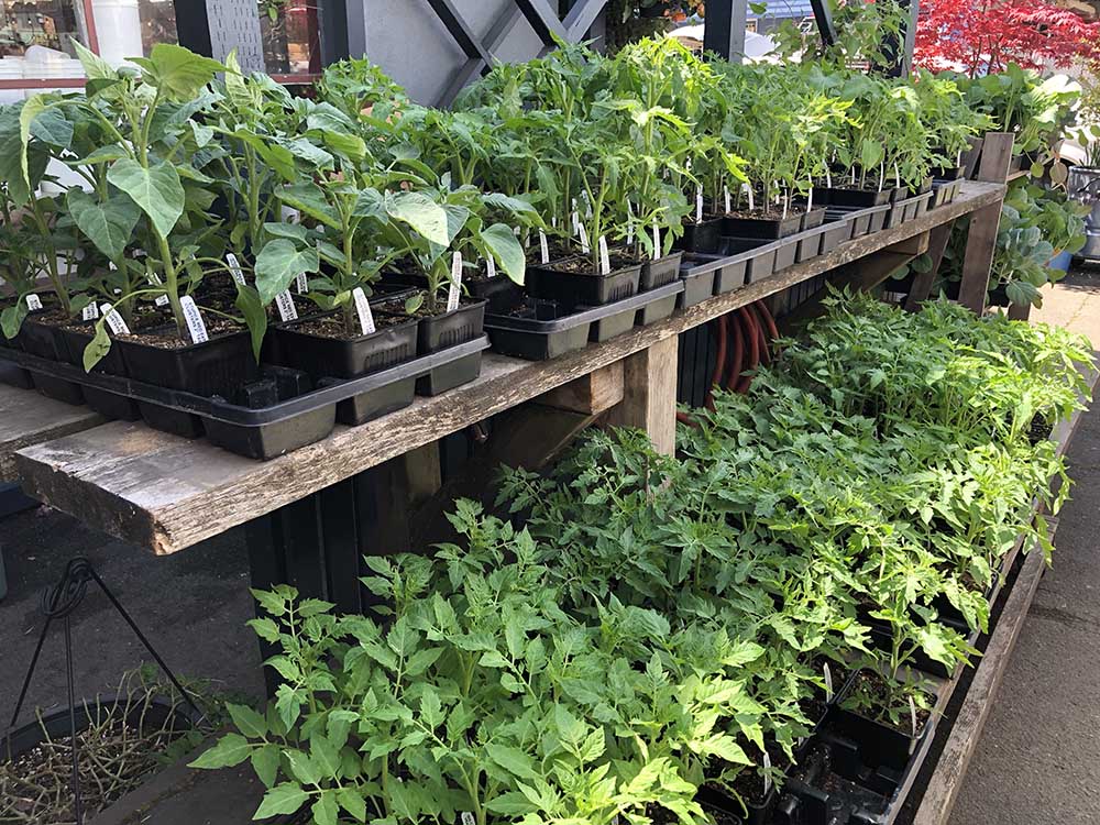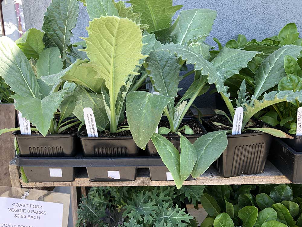 We also have grape starts, sedums, dahlias, marigolds, and those lovely hanging baskets. And did I mention the artichokes? We’ve got more plants coming in almost every day these days, so drop by often and see what’s new!