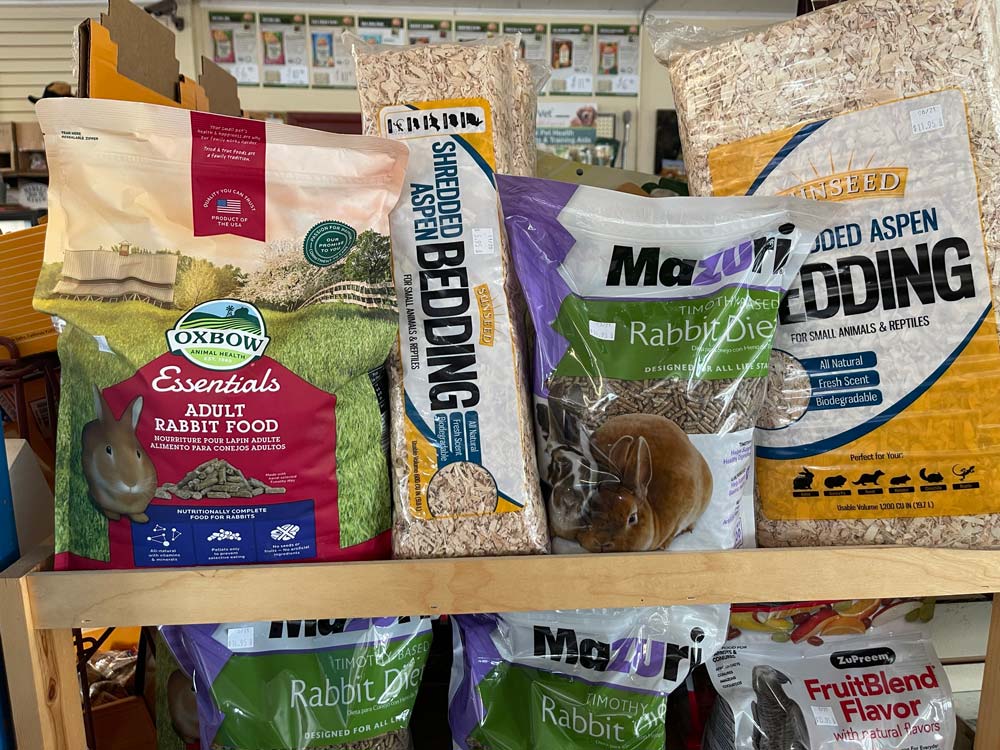 We offer Oxbow, Mazuri, Purina and Farm Club rabbit food. We also carry timothy hay, which is a great healthy snack for bunny rabbits, guinea pigs as well as chinchillas. We also offer a variety of options for small animal bedding, feeders and water containers / dispensers which are perfect for rabbits, ferrets and many other kinds of small animals.